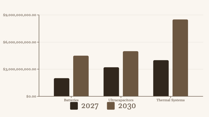 - Ultracapacitors projected at $5B by 2030 (CAGR 25%)